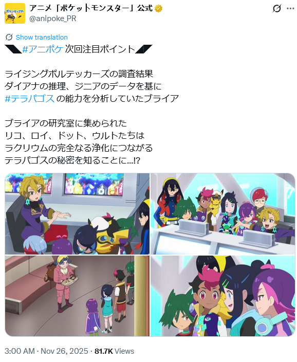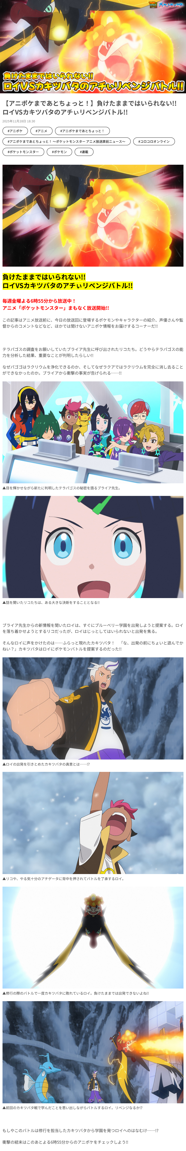 ブライアに集められたリコたち。ブライアが語るのは、テラパゴスの秘密、そしてラクリウム浄化に繋がる推理。情報を聞き、すぐにブルーベリー学園を出発しようと焦るロイ。その様子を見たカキツバタは、ポケモンバトルを提案する…!迷うロイだったが、リコたちに背中を押され、カキツバタへのリベンジに挑むことに―!!
