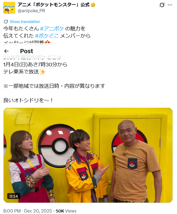 We've received a message from the Pokédoko hosts, who have presented lots of highlights from the Pokémon anime this year as well! The first PokéDoko episode of 2026 will air on the TV Tokyo Network Sunday January 4th, 2026 at 7:30am. (airdate, airtime and content may vary depending on region) Happy new year to YOtoshidori!