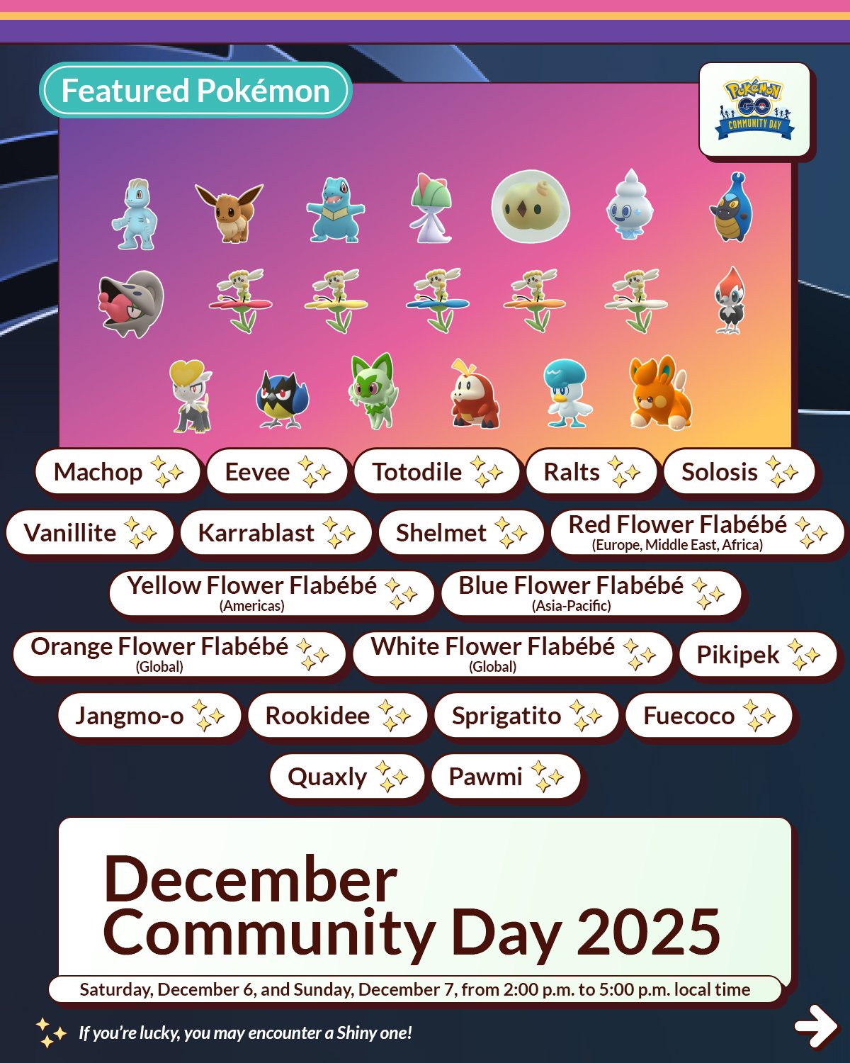 The following Pokémon will be featured on Saturday, December 6, 2025, from 2:00 p.m. to 5:00 p.m. local time.