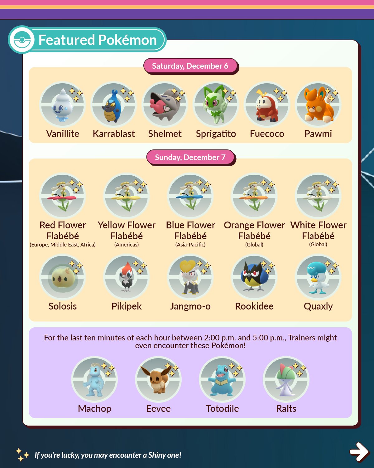 The following Pokémon will be featured on Sunday, December 7, 2025, from 2:00 p.m. to 5:00 p.m. local time.