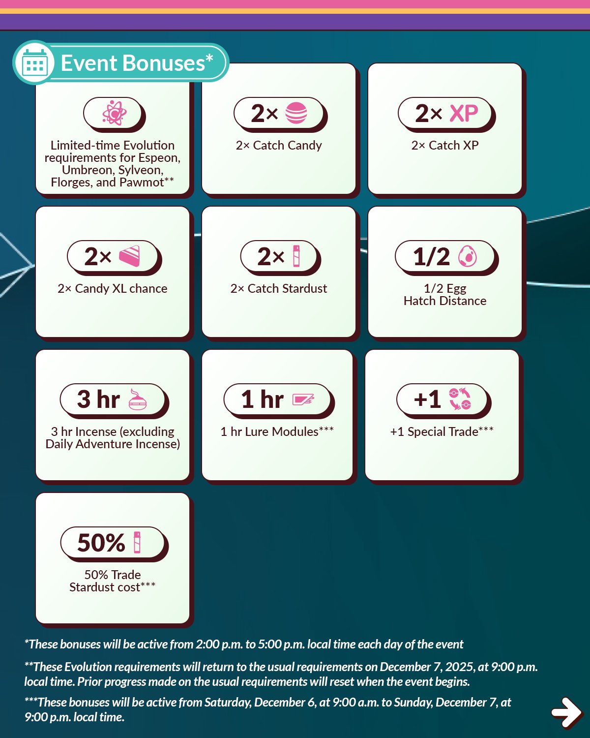 **While most bonuses are only active on December 6 and 7 from 2:00 p.m. to 5:00 p.m. local time, these bonuses will be active from Saturday, December 6, at 9:00 a.m. to Sunday, December 7, at 9:00 p.m. local time.