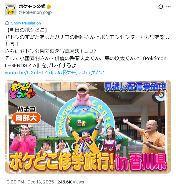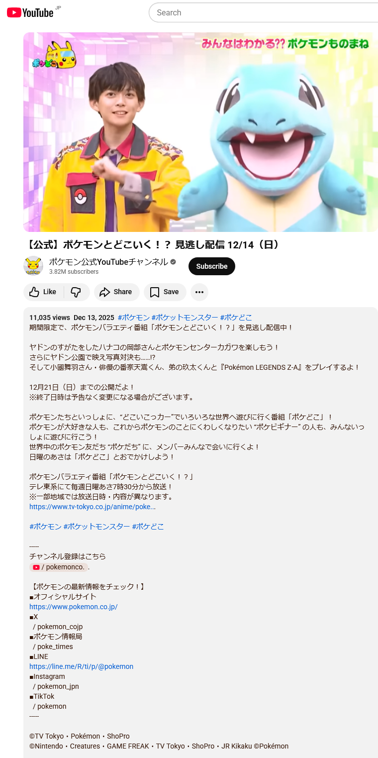 The official Japanese Pokémon X account posted a reminder on December 14th that this episode was available to watch on the official Japanese YouTube channel. The video was region locked. It was available from December 14th to December 21st, 2025. This episode was specifically labeled as a missed-program webcast (見逃し配信).