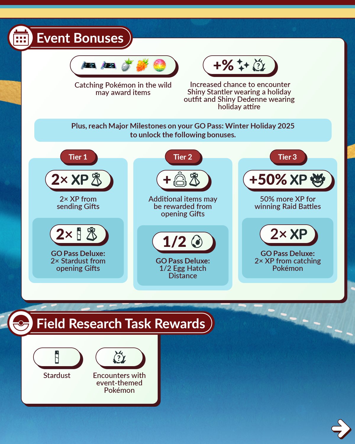 - Bonus daily quests for your GO Pass: Winter Holiday 2025.