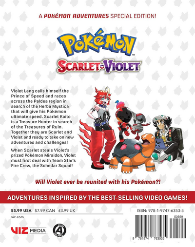 Violet Lang calls himself the Prince of Speed and races across the Paldea region in search of the Herba Mystica that will give his Pokémon the ultimate speed. Scarlet Koito is a Treasure Hunter in search of the Treasures of Ruin. Together they are Scarlet and Violet, and ready to take on new adventures and challenges!